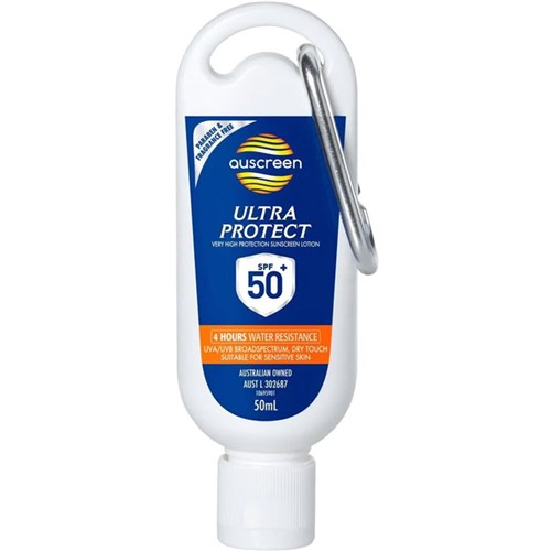 This Auscreen Ultra Protect SPF50+ Sunscreen has been formulated to provide high protection against the sun and harmful UVA and UVB rays. It applies smoothly without being greasy and has a dry-touch formulation. It complies with AS/NZS 2604:2012 standards. It is SPF 50+ to offer a high level of protection. It is fragrance-free and suitable for use on the face and body. Water-resistant for up to 4 hours. It should be applied liberally and evenly at least 20 minutes before swimming or sun exposure and then reapplied every 2 hours. Contains Aloe Vera and Vitamin E to help hydrate, moisturise and smooth the skin. The active ingredients include Homosalate 60 mg/g, Octocrylene 80 mg/g and Butl Methoxydibenzolmethane 30 mg/g. It also contains Phenoxyethanol. 50ml Carabiner.