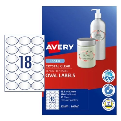 Avery Blank Printable Labels L6024C 63.5 x 42.3mm Oval Clear 18UP 180 Labels 10 Sheet