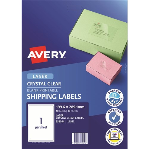 Avery Crystal Clear Laser Address Labels 199.6x289.1mm 1UP 10 Labels 10 Sheets
