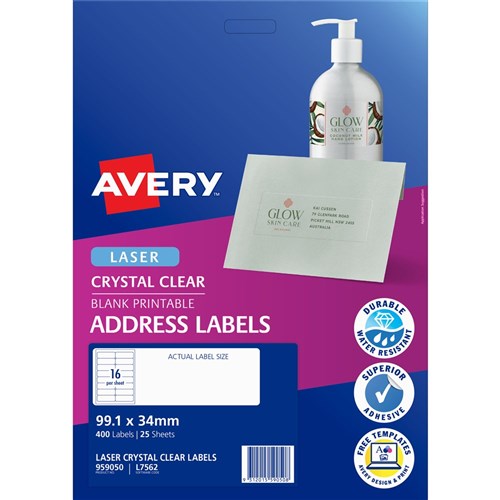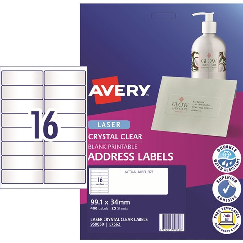 Premium glossy clear material is 100 percent transparent. Virtually disappear when applied to white and coloured surfaces. Jam-Free reliability for trouble free printing, saving time and minimising wastage. Ideal for envelopes, letters and product labelling. Made in Australia. Size: 99.1x34mm 400 labels, 25 sheets. 16 labels per sheet (16UP).