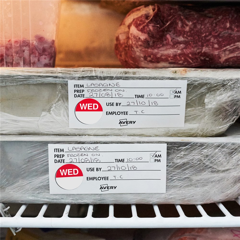 Visually identifies discard date of prepared food. Space to write the date on the label. Ideal for commercial refrigeration and food storage applications. Temperature -5 to +65C. Removable adhesive adheres to a variety of surfaces and removes easily.