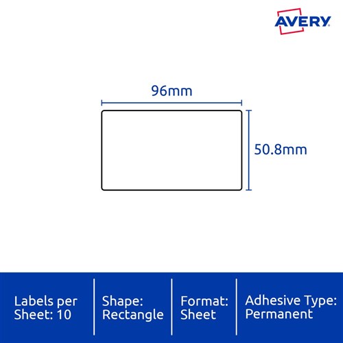 Engineered to take on tough applications where a standard label is not fit for purpose. Durable labels are tear proof, water, dirt, oil and UV resistant with permanent adhesive. Ideal for asset identification on computers, laptops, tablets, tools, labelling medications, samples and containers for use in refrigerators. Unaffected by temperature variations -40°C to +150°C. Customise your labels with Avery Design and Print, available at averyproducts.com.au/print. Size: 96x50.8mm 200 labels, 20 sheets. 10 labels per sheet (10UP).