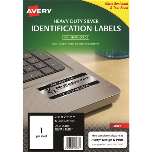 Avery Heavy Duty Laser Labels Asset Tags Silver L6013 208x295mm 1UP 20 Labels