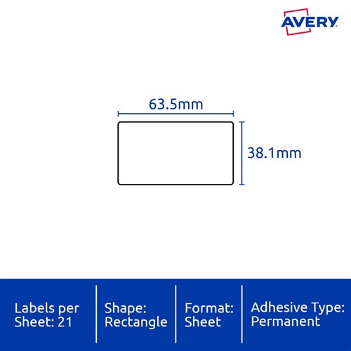 Heavy duty, waterproof, UV, oil and tear resistant unaffected by temperatures between -20°C to 80°C. Ideal for labelling equipment and organising property. Engineered to take on tough applications where a standard label is not fit for purpose. Customise your labels with Avery Design and Print, available at averyproducts.com.au/print. Made in Australia. Size: 63.5x38.1mm 525 labels, 25 sheets. 21 labels per sheet (21UP).