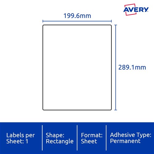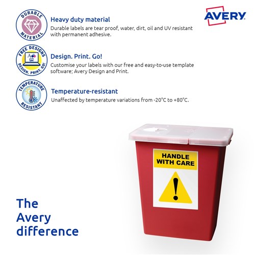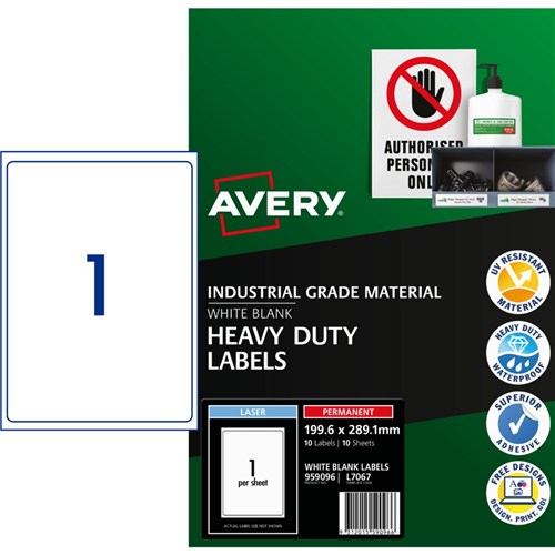 Heavy duty, waterproof, UV, oil and tear resistant unaffected by temperatures between -20°C to 80°C. Ideal for labelling equipment and organising property. Engineered to take on tough applications where a standard label is not fit for purpose. Customise your labels with Avery Design and Print, available at averyproducts.com.au/print. Made in Australia. Size: 199.6x289.1mm 10 labels, 10 sheets. 1 label per sheet (1UP).
