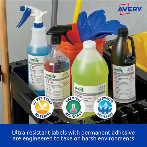 Ultra-Resistant Labels are saltwater resistant and certified for GHS Chemical Labelling with permanent adhesive and engineered to take on harsh environments. Unaffected by temperature variations -40?C to +150?C. Ideal for chemical labelling requirements and for onsite chemical decanting. Used in marine and harsh environments, ideal for safety signs, arc flash and tanks. Customise your labels with Avery Design and Print, available at averyproducts.com.au/print. Size: 99.1x67.7mm 80 labels, 10 sheets. 8 labels per sheet (8UP).