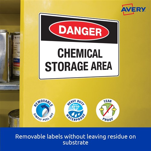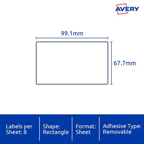 Weather, UV, oil and dirt resistant. Unaffected by temperature variations -20°C to +80°C. Removable adhesive formulated to adhere to a wide variety of surfaces without leaving residue. Ideal for creating temporary labelling of equipment, facilities and storage supplies, stock take and organising workshops. Customise your labels with Avery Design and Print, available at averyproducts.com.au/print. Size: 99.1x67.7mm 160 labels, 20 sheets. 8 labels per sheet (8UP).