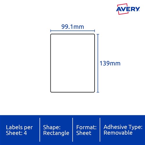 Weather, UV, oil and dirt resistant. Unaffected by temperature variations -20°C to +80°C. Removable adhesive formulated to adhere to a wide variety of surfaces without leaving residue. Ideal for creating temporary labelling of equipment, facilities and storage supplies, stock take and organising workshops. Customise your labels with Avery Design and Print, available at averyproducts.com.au/print. Size: 99.1x139mm 80 labels, 20 sheets. 4 labels per sheet (4UP).