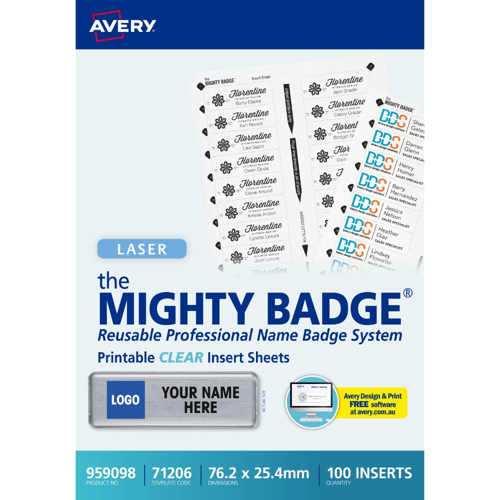 Use with Avery Mighty Badge Name Badge System. Refill contains 5 insert sheets with 20 clear inserts per sheet, including 100 clear inserts in total. Insert clear refills into name badges from the Avery Mighty Badge. Perfect for a variety of industries such as hospitality, business and health care. Customise your labels with Avery Design and Print, available at averyproducts.com.au/print. Suitable for laser printers and copiers. Size: 76.2 x 25.4mm.
