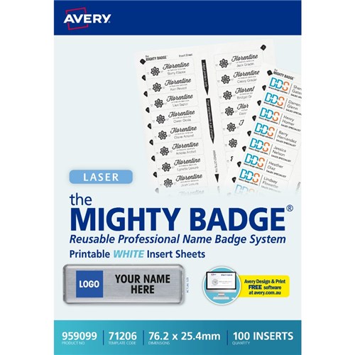 Use with Avery Mighty Badge Name Badge System. Refill contains 5 insert sheets with 20 white inserts per sheet, including 100 white inserts in total. Insert white refills into name badges from the Avery Mighty Badge. Perfect for a variety of industries such as hospitality, business and health care. Customise your labels with Avery Design and Print, available at averyproducts.com.au/print. Suitable for laser printers and copiers. Size: 76.2 x 25.4mm.