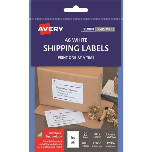 A6 shipping laser labels are ideal for printing and labelling parcels and large envelopes one at a time. Equipped with TrueBlock® technology the A6 shipping labels provides a professional finish to your outgoing mail. They cover information that is underneath, including text and logos. Customise your labels with Avery Design and Print, available at averyproducts.com.au/print. FSC Made in Australia. Size: 105x148mm 25 labels, 25 sheets. 1 label per sheet (1UP).