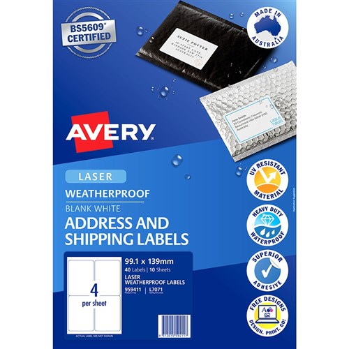 Durable water-resistant labels provide strong protection against harsh elements. UV-resistant, water-resistant and weatherproof. Customise your labels with Avery Design and Print, available at averyproducts.com.au/print. Perfect for shipping, addressing, priority messages, warning labels and more. Made in Australia. Size: 99x1x139mm 40 labels, 10 sheets. 4 labels per sheet (4UP).