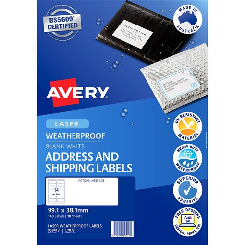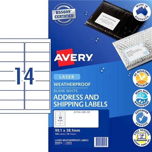 Durable water-resistant labels provide strong protection against harsh elements. UV-resistant, water-resistant and weatherproof. Customise your labels with Avery Design and Print, available at averyproducts.com.au/print. Perfect for shipping, addressing, priority messages, warning labels and more. Made in Australia. Size: 99.1x38.1mm 140 labels, 10 sheets. 14 labels per sheet (14UP).