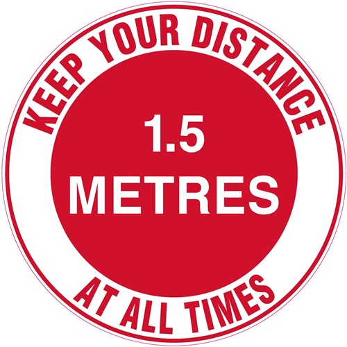 Wording: Keep Your Distance 1.5 Metres At All Times. Self-adhesive walk-on floor sign designed to bond to many different surfaces. Self adhesive vinyl with protective over laminate. Suitable for heavy traffic areas or wall mounting applications where graffiti or heavy wash downs are a problem. Easy to remove, just peel off the marker and wipe down the surface area. Suitable for internal use. Size: 300mm diameter.