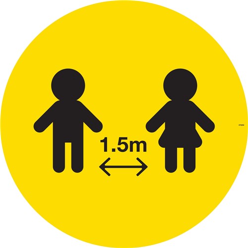 Wording: 'Kids 1.5M Picto' (Yellow With Black Picto). Self-adhesive walk-on signs designed to bond to many different surfaces. Clear textured overlaminate protects warning message. Perfect for schools. Vibrantly coloured with an easily recognisable pictogram to ensure children are aware of the social distancing guidelines in effect. Suitable for internal use. Size: 300mm diameter.