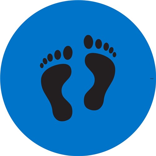 Wording: Stand Here 'Footprints' picto. Self-adhesive walk-on signs designed to bond to carpet. Clear textured overlaminate protects warning message. Vibrantly coloured with an easily recognisable pictogram to ensure children are aware of the social distancing guidelines in effect. Suitable for heavy pedestrian areas such as schools, nursing homes, and public areas which are carpeted. Easy to remove, just lift one edge of the marker and pull. Australian made. Size: 300mm diameter.