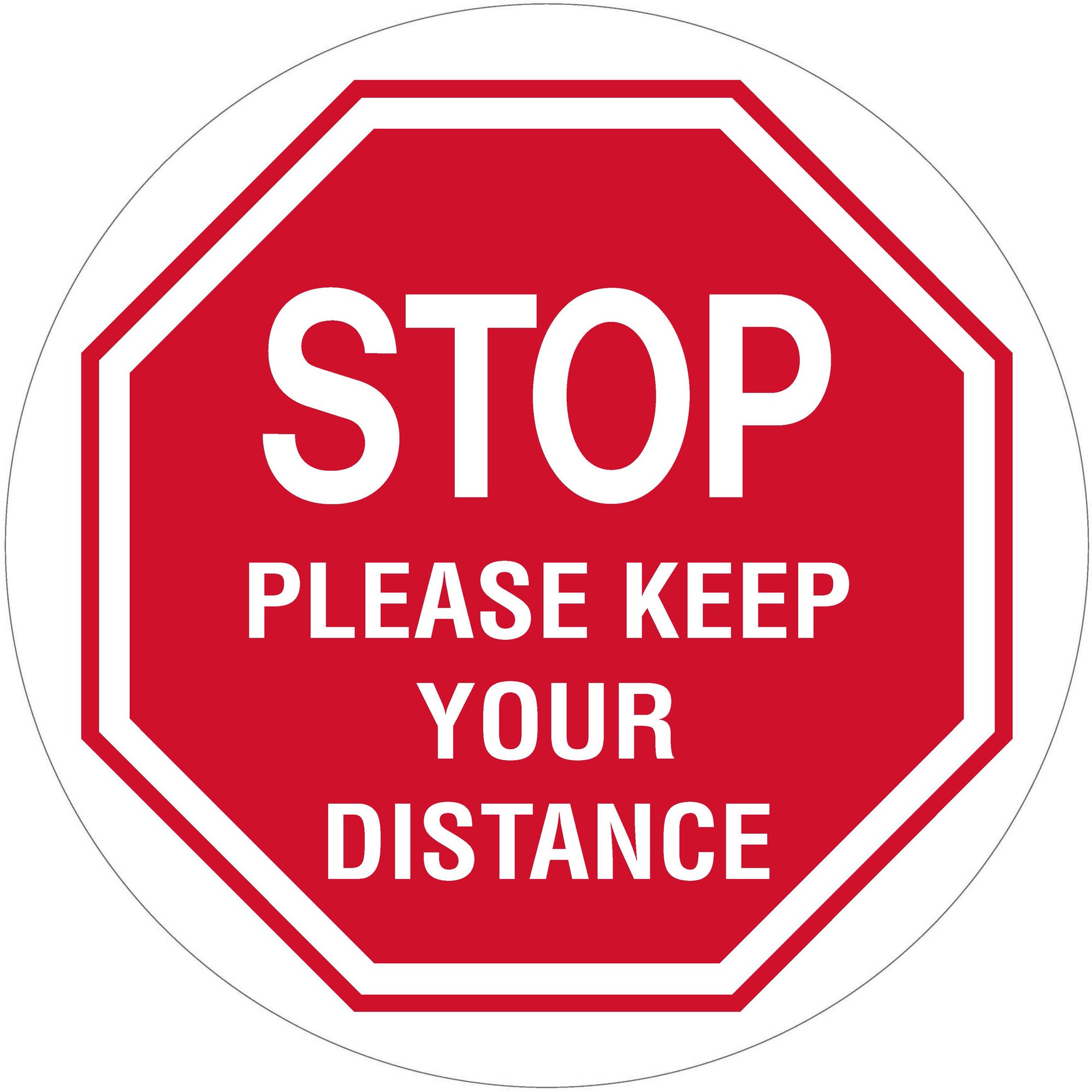 Wording: Stop Please Keep Your Distance. Self-adhesive walk-on signs designed to bond to carpet. Clear textured overlaminate protects warning message. Suitable for heavy pedestrian areas such as schools, nursing homes, and public areas which are carpeted. Easy to remove, just lift one edge of the marker and pull. Size: 300mm diameter.