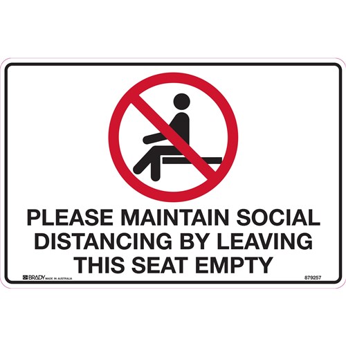 Wording: Please Maintain Social Distancing By Leaving This Seat Empty. Colour: White, red and black. Material: Multiflute corrugated plastic. Complies to Australian Standard AS1319-1994. Prohibition signs specify behaviour or actions which are not permitted. Commonly found in offices, shopping centres and high traffic locations where specific actions could be potentially dangerous. Assists in communicating a message where there may be a worker or visitor with a language barrier. Size 450W x 300mmH.