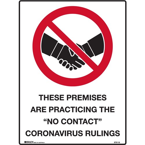 Wording: These Premises Are Practicing The 'No Contact' Coronavirus Rulings. Colour: White, red and black. Material: Self-adhesive vinyl. Size: 180W x 250mmH.