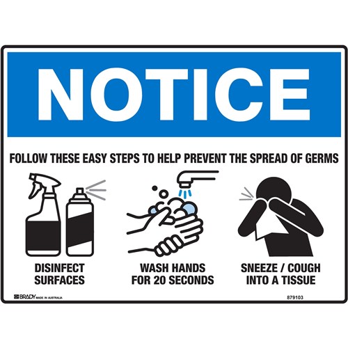 Help minimise the spread of COVID-19 in your facility with Brady's range of hygiene signs, social distancing signs . Wording: Notice Sign With Pictos: Follow These Easy Steps To Help Prevent The Spread Of Germs, Disinfect Surfaces, Wash Hands For 20 Seconds, Sneeze/Cough Into A Tissue. Material: Self-Adhesive Vinyl. Size:H180 X W250mm.
