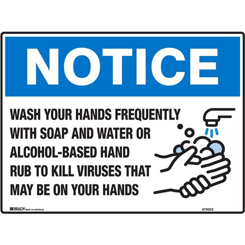 Help minimise the spread of COVID-19 in your facility with Brady's range of hygiene signs, social distancing signs . Wording: Notice Sign Wash Your Hands Frequently With Soap And Water Or Alcohol-Based Hand Rub To Kill Viruses That May Be On Your Hands . Material: Multiflute Corrugated Plastic. Size:H450 X W600mm.