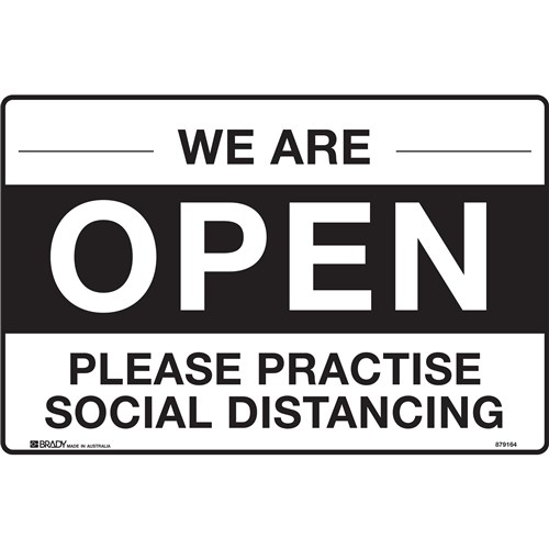 Brady Safety Sign We Are Open Practice Social Distancing H300xW450mm Polypropylene