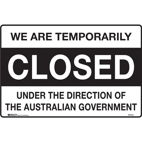 Brady Safety Sign We Are Temporarily Closed Under Gov. H300xW450mm Corflute