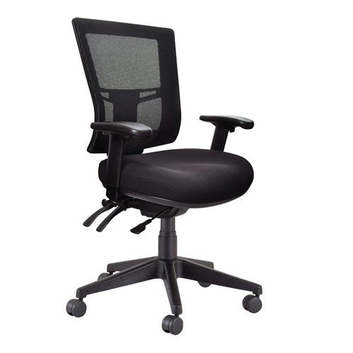Fabric seat mesh back black. Chair Capacity: 180kg. Composition: Upholstered seat and mesh back, nylon base. Seat Width: 520mm. Seat Depth: 420-470mm. Back Height: 530mm. Indicative Seating Time: Multishift 24/7. 10 Year Manufacturer's Warranty. Delivery, installation and assembly charges may apply to furniture. Please enquire to confirm.
