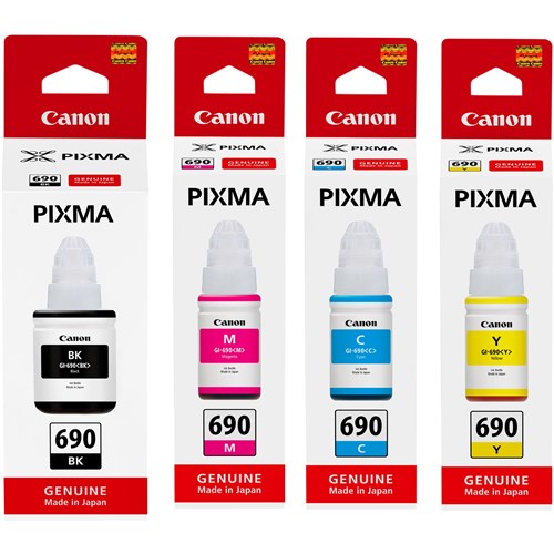 Compatible with Canon Pixma printers: G2600, G3600 and G4600. It has an estimated page yield of 6000 pages. Spill resistant bottle design. Hybrid Ink system. This pack contains each bottle of GI690 in cyan, magenta, yellow and black.
