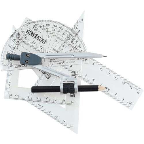 School essential for students. Ideal for beginners. Includes compass, pencil and ruler. Also includes protractor 45/60 degree set squares.