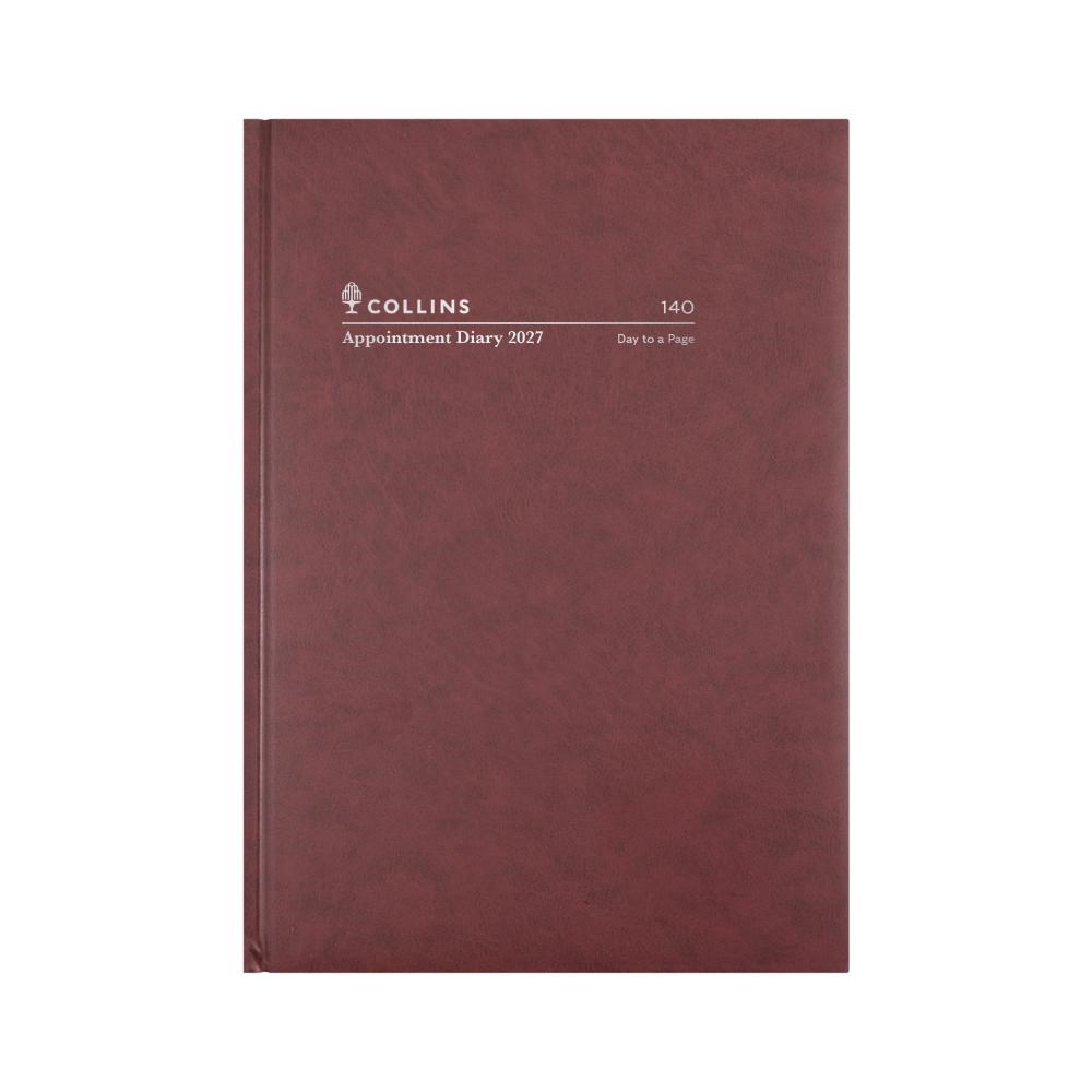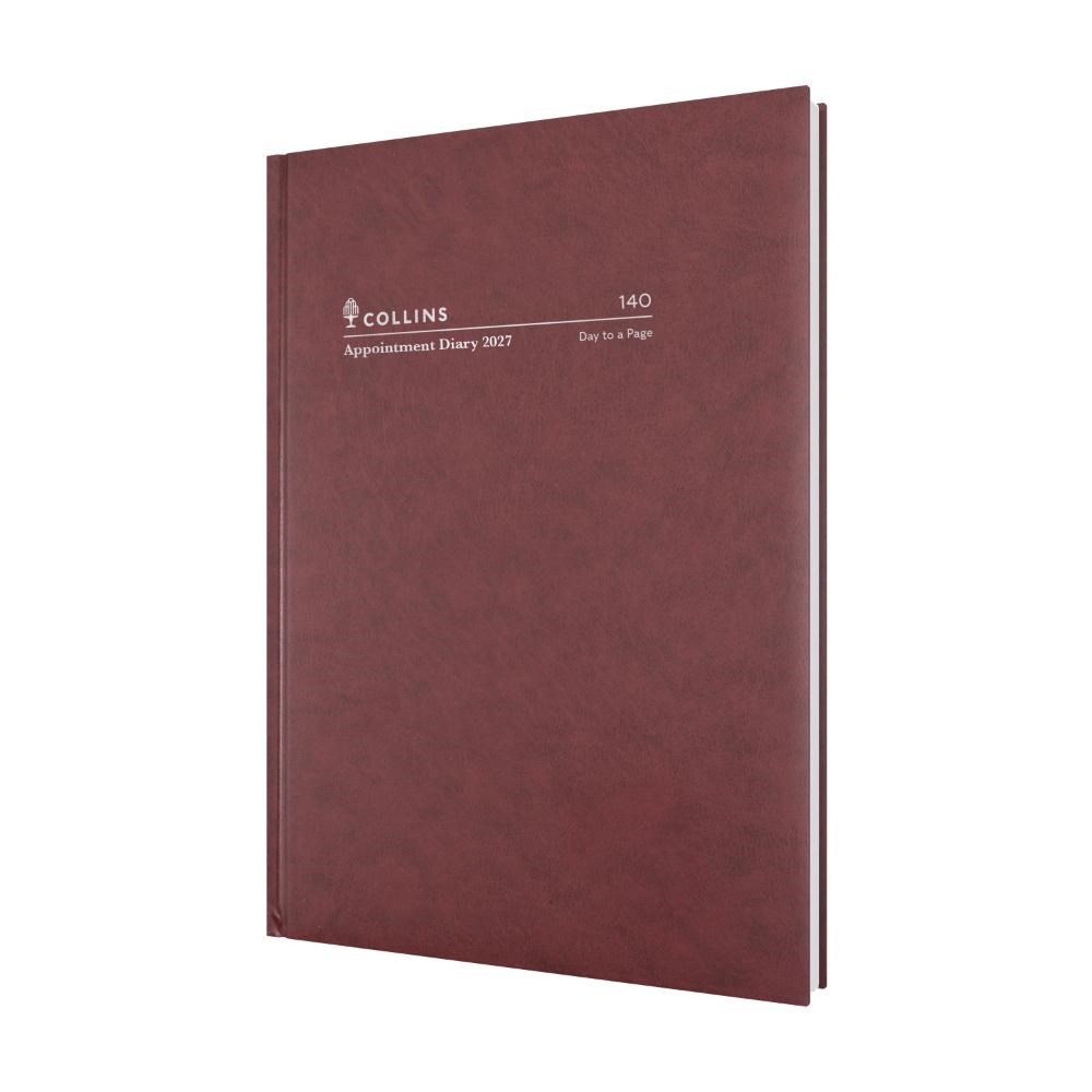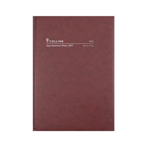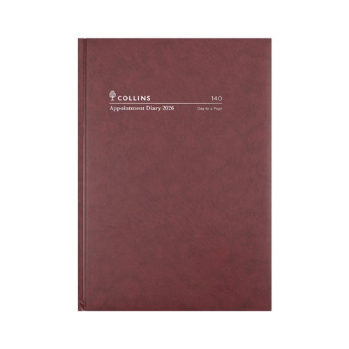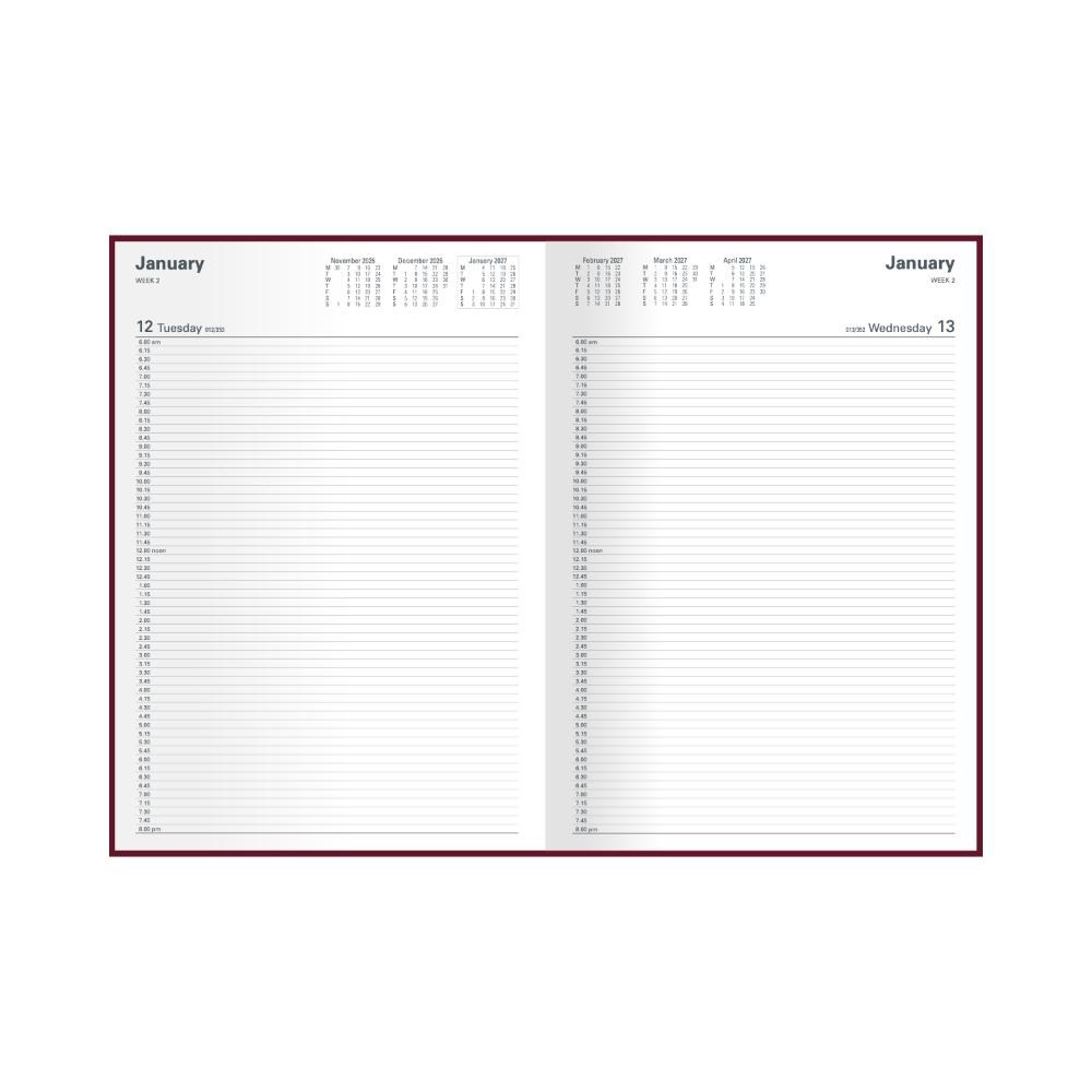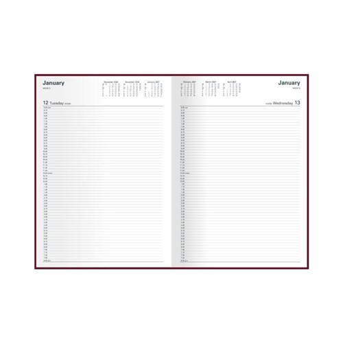 Bound in deep burgundy, with sections sewn for extra strength. Features lay flat opening, ribbon marker, day to page layout. Appointment times from 6am - 8pm 1/4 hourly. Australian and New Zealand Holidays. Page layout include six month calendars, week counts, Julian day and times printed clearly down each page. 3 year calendars. Current and forward year planner. Calendar notes, conversion tables, staff leave and addresses. Size: 297 x 210mm. FSC Certified.