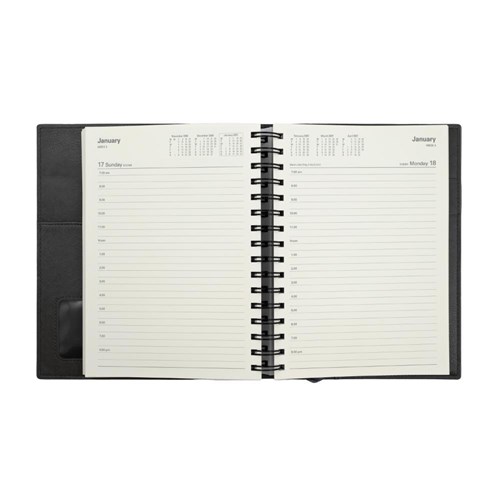 Ideal for those 'on the move' with its double wiro binding and heavily grained metallic and matt PU cover. Has a removable jacket sleeve, pen loop and internal storage pockets. Hourly appointment times. Monthly planners, staff leave and financial summary. 3 year calendars. Addresses and notes. Australian and New Zealand holidays. Current and forward year planners. Tax information.