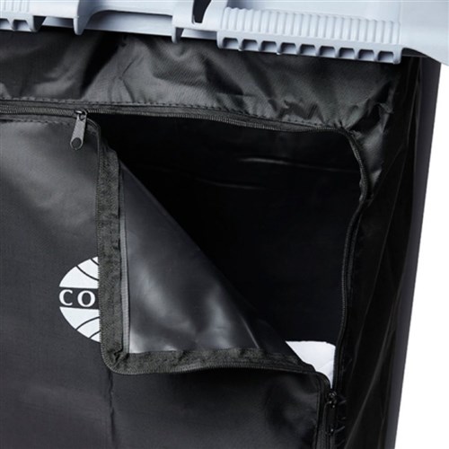 Assembly required Hard cover lockable doors and 2 x 100L bags with metal eyelets and side zip access All round bump protection 2 fixed & 2 swivel 200mm castor wheels Under carriage tray holder Load limit 110kg Weight: 43Kg. Dimensions: 154L x 54W x 129cmH.