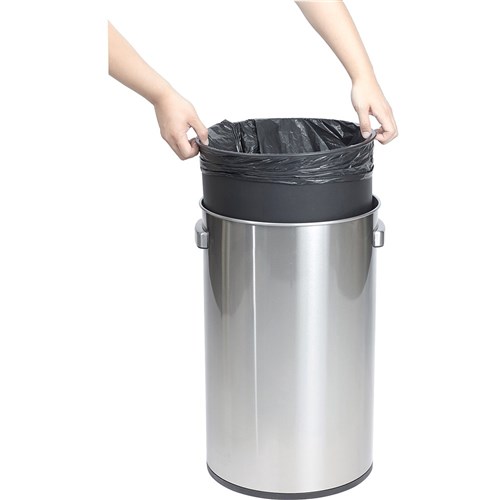 201 grade stainless steel. Side handles for easy lifting. Solid plastic liner with bag holding grips. Fingerprint resistant. Wide lid covers trash bag completely. Plastic non-slip base. Indoor use. Volume: 60 litres. Size: 405mm Diameter x 690mm Height. Lid opening diameter: 240 mm.
