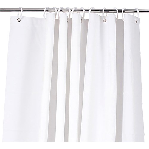 PEVA non-chlorinated vinyl material. 12 plastic rings included for 12 eyelets. Plain finish (no pattern on material). Water resistant and water repellent. Light weighted base. Warm machine washable, remove rings. Rinse well, line dry in shade recommended. Cleaning with strong cleaning chemicals not recommended. Dimensions: 1800W x 1800mmH.