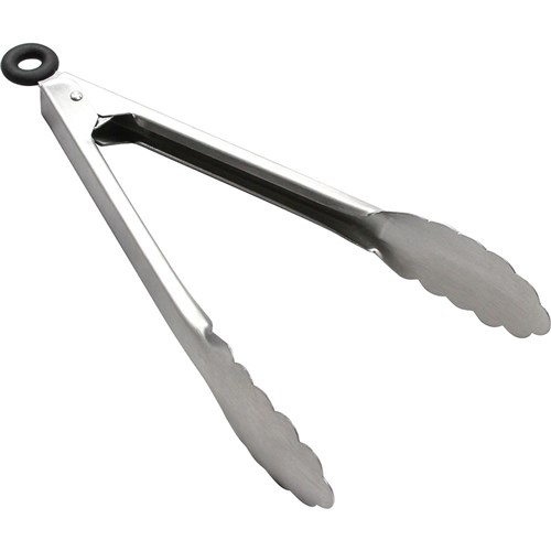 Heavy duty. Dishwasher safe. Must be dried after washing. Rubber end hook to hang tongs for easy storage. Length: 230mm.