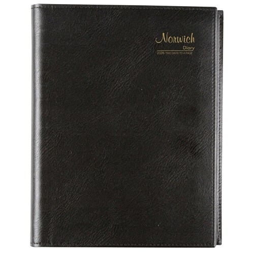 Featuring a stylish flexible leather grain cover finished with the famous gold foil 'Norwich' logo, stitched edges and fine ivory paper. Spiral bound. Deluxe pocket inside the front cover, perfect for holding your receipts. 2 days to a page layout. 1 hour appointment times 8am - 5pm, Monday to Sunday. 3 year reference calendars. Weights and measurements. Current and forward year planners. Australian and New Zealand holidays and term dates. Includes a ribbon bookmarker to mark significant dates, events, or entries within the diary. Includes a ribbon bookmarker to mark significant dates, events, or entries within the diary. 70gsm paper. FSC Certified.