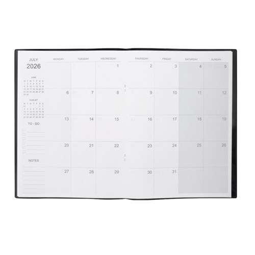 Casebound diary with current year embossed in PVC cover and all-round border stitching. Month to view layout planner to keep track of appointments, meetings, and other important events. No appointment times. FSC Certified.