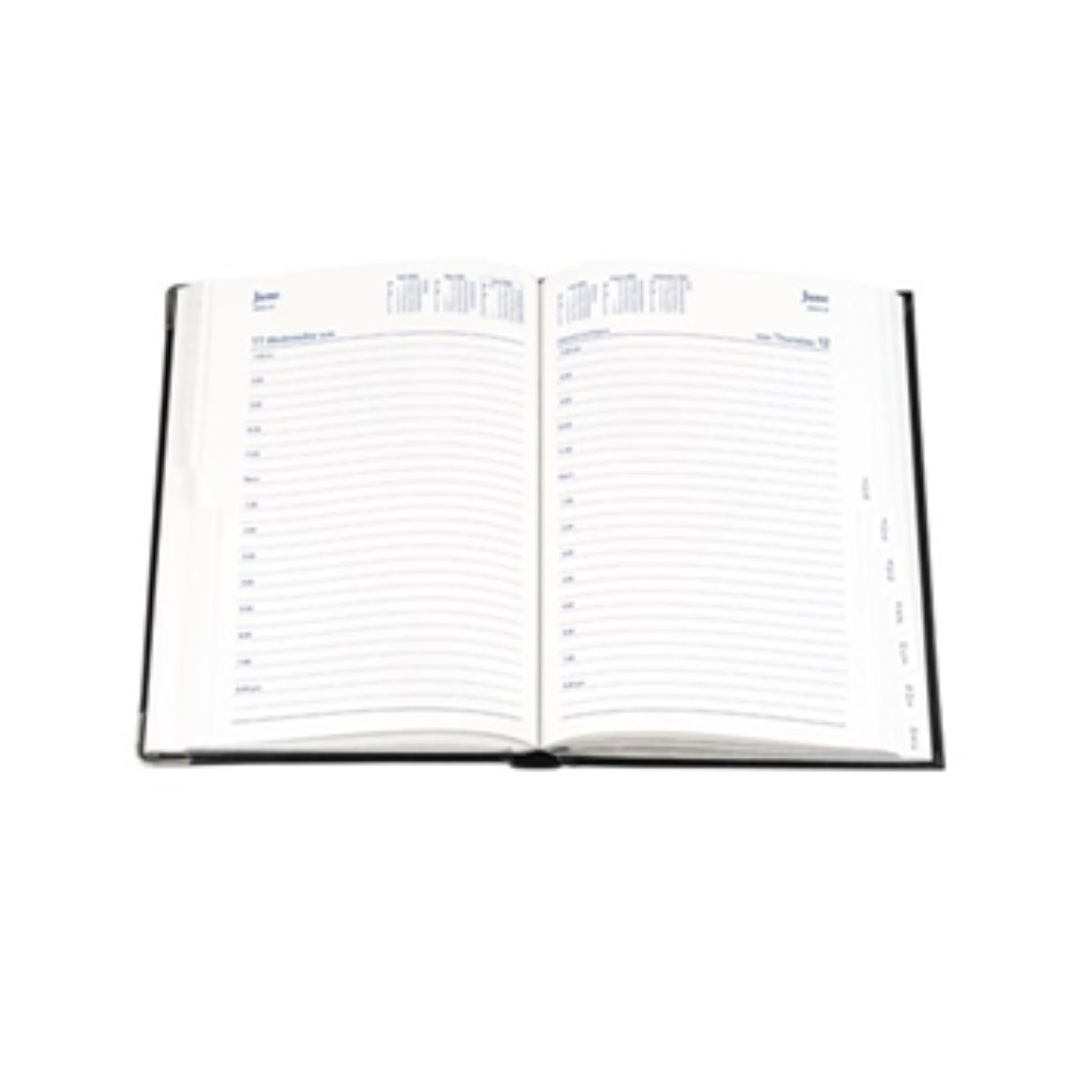 Bound in black bonded leather with silver corners and page edging. Appointment times from 7am - 8pm hourly. Australian and New Zealand Holidays. Ribbon marker. Lay flat opening. Tabs. Size: 210 x 148mm. FSC Certified.