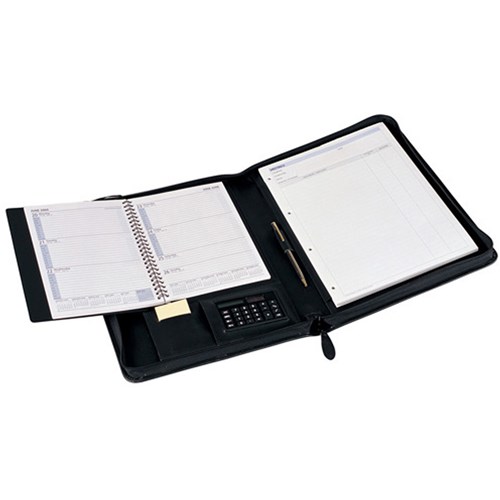 • Soft touch leather look PU zippered compendium featuring an Associate A5 Week to an Opening wiro bound diary, calculator, zippered gusset pocket, pen, post-it notes and meeting notepad.