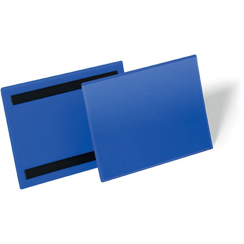 Document pockets with two magnetic strips on the back. Use on metal surfaces, such as warehouse shelves and metal containers. Hardwearing blue polypropylene back with clear window for insertion of labels. Two heavy-duty magnets on the back of each pocket. Inserts can be exchanged quickly. Design and print professional labels using free online software available at www.duraprint.