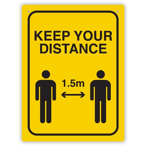 Size: 225W x 300mmH. Sign is yellow and black. Wording: Keep Your Distance 1.5m (with pictogram). Manufactured from high-quality polypropylene for strength and durability. Ideal for communicating to customers, staff or any other group of people, the social distancing message. Suitable to display both indoors or outdoors. The two holes at the top of each sign allow it to be attached to fences or walls using nails or screws. Light enough to be fixed using double sided tape or hook and loop adhesives. Made in Australia.