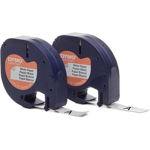 Suits Dymo® Letratag® LT100H Label Makers. Includes: Two rolls of 12 mm x 4 m paper labels, black text on white labels. Highly visible peal-and-cut labels are perfect for the home. Black print on a white surface creates clear, highly visible text. Economical, stress-free labeling. Perfect for home organisation projects and to help organise files and binders.