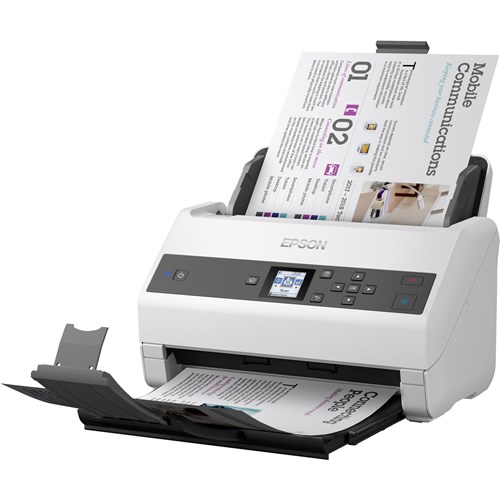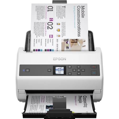 Sheet Feed, one pass duplex A4 colour scanner. Up to 85 ppm/170 ipm; single-pass duplex scanning. High-volume batch scanning - a 100-page Automatic Document Feeder handles even the biggest jobs, offers a peak daily duty cycle of up to 9000 sheets. Includes TWAIN and ISIS drivers for easy integration with existing software; PC and Mac compatible. Colour LCD display and convenient buttons offer easy access to user-defined jobs, settings, modes and maintenance. Scan mixed stacks of business and ID cards, single sheets, long documents, and folded pages up to 11' x 17' (carrier sheet required for folded oversized pages, sold separately). Includes a Slow Speed Mode for delicate sheets; Double-feed Detection and Paper Protection prevent misfeeds. Powerful and compact desktop scanner easily fits within virtually any workspace. Includes Epson Document Capture software to create searchable PDFs, or scan to online storage accounts like Evernote, SharePoint and Google Drive. Optional Flatbed Dock to connect to a compatible Epson photo scanner for scanning photos, passports, or bound materials (both sold separately). 1 Year Manufacturer's Warranty.