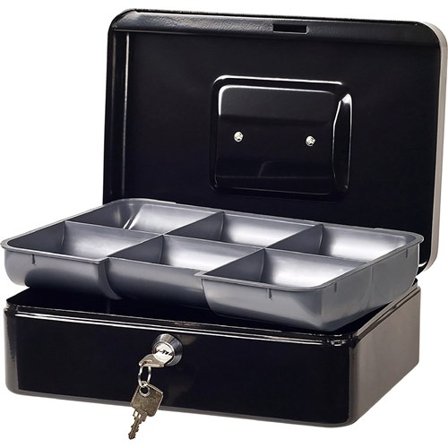 Classic Cash Boxes are fully assembled with a handle that folds neatly into the recess when not in use. Sturdy steel construction with rounded corners allows for greater strength and durability. Supplied with two keys and a partitioned coin tray. Also available in beige.