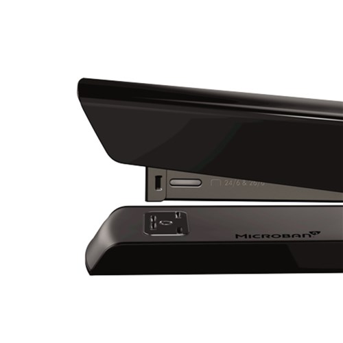 Full strip desktop stapler for up to 20 sheets. Holds a full strip of 210 staples. Durable construction and jam-free design. Constructed with premium materials and a durable metal housing. Tacking and pinning options for attaching documents to bulletin boards or for temporary stapling. Low staple indicator window. Microban antibacterial technology works 24/7 for an added level of hygienic product protection. Compatible with 26/6 staples. 10 Year Manufacturer's Warranty.