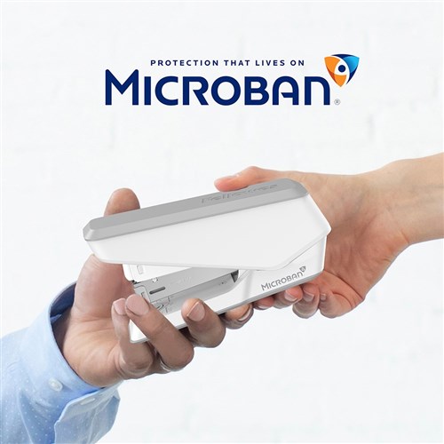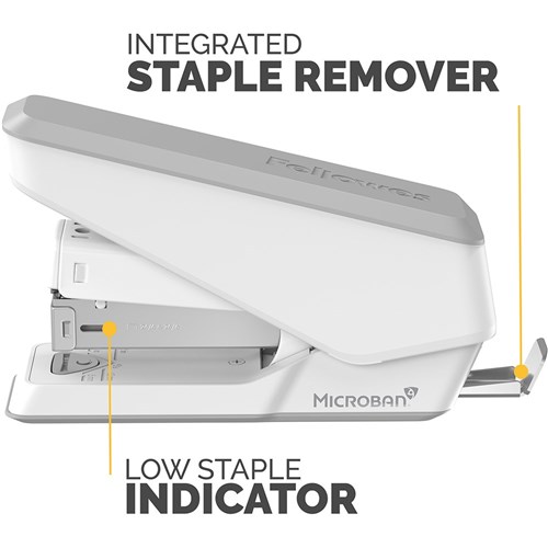 Effortlessly staples up to 25 sheets. Durable construction and jam-free design. Microban® antibacterial technology works 24/7 for an added level of hygienic product protection. Includes a detachable staple remover, paper alignment guide and soft-grip handle. Low staple indicator window. Compatible with 24/6 and 26/6 staples. 10 Year manufacturer's warranty.