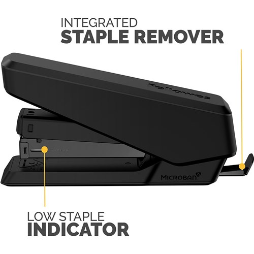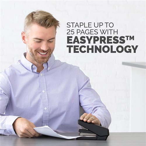 Full-strip EasyPress™ stapler effortlessly staples up to 25 sheets. Durable construction and jam-free design. Microban® antibacterial technology works 24/7 for an added level of hygienic product protection. Includes a detachable staple remover, paper alignment guide and soft-grip handle. Low staple indicator window. Compatible with 24/6 and 26/6 staples. 10 Year manufacturer's warranty.