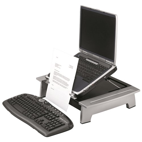 Reduces shoulder, neck, and eye strain by positioning a monitor or laptop at a comfortable viewing angle. Adjustable feet allow optimal height positioning Top platform features height and tilt adjustment for a laptop. In-line copyholder positions documents for easy, comfortable viewing. Includes storage drawer to organise business essentials. As a monitor riser holds up to 36kg As a laptop raiser holds up to 4 5kg (for heavy laptops). Stow laptop or copyholder underneath for space-saving storage. Dimensions: 505W x 36D x 106mmH. (Approximate). 5 Year manufacturer's warranty.
