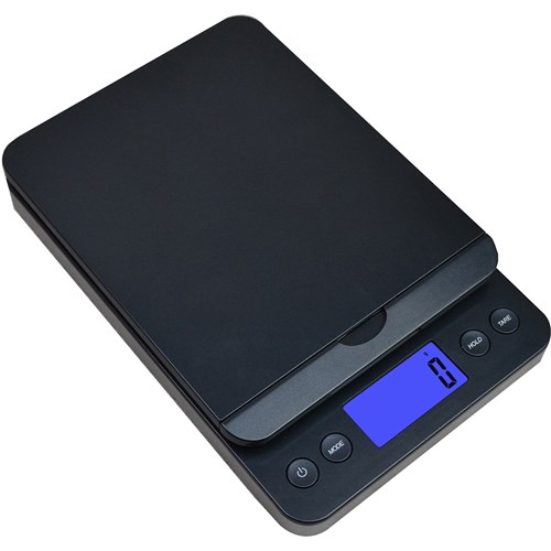 Weighs in grams, ounces, pounds and kilograms. Weight hold and tare functions. Digital display with blue backlit light. Measures in 5 gram increments. Comes complete with batteries and AC adaptor. Rubber foot pads for added stability. 1 Year Manufacturer's Warranty.